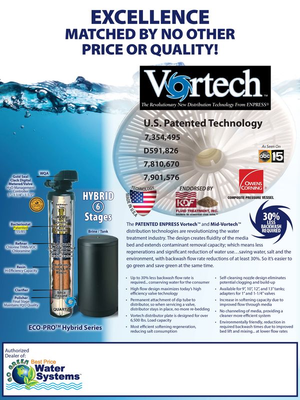 Our ECO-PRO Hybrid Whole Home Water Softener Filtration System utilize the Patented Vortech™ Plate design that creates fluidity of the media beds and extends contaminant removal capacity; which means less regeneration's and significant reduction in water use. Saving 30% less water, and up to 30-50% less salt helps save our environment. This makes the ECO-PRO series the most Eco-Friendly Water Systems on the planet.